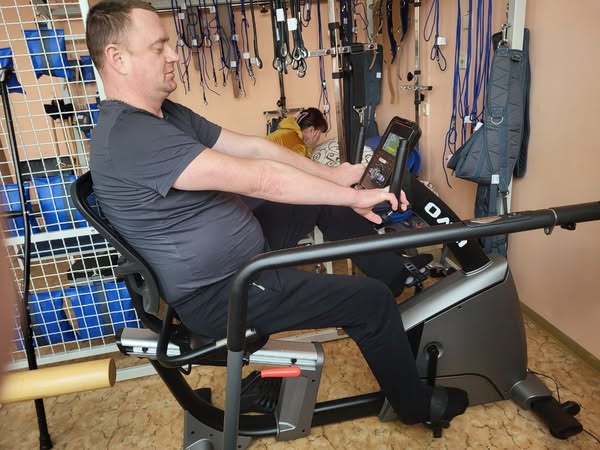 На велосипеді-тренажері займається військовослужбовець Олександр Пекалюк. Тут чоловік проходить реабілітацію після множинних травм гомілки. Для цього мультидисциплінарна команда розробила комплекс індивідуальних вправ, зважаючи на потреби військовослужбовця. Каже, на дев’ятий день реабілітації відчув значне покращення. Заняття на тренажері-велосипеді – одна із вправ, де за допомогою регулювання темпу та швидкості дається поступове навантаження на ноги.